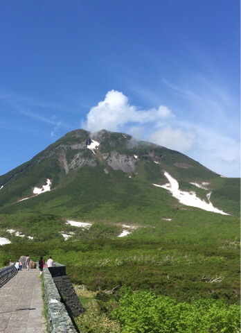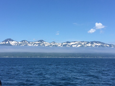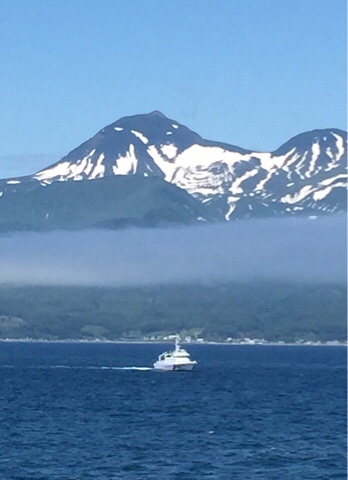 これが知床半島で一番高い「羅臼岳」です。日本百名山の一つで雪が残っています。